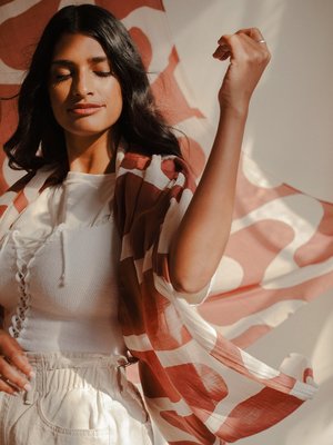 Sunday/Monday's Waves scarf is now available in a deep, earthy clay color way. Perfect for weekend getaways and cozying up in front of a fire with friends. - 35 x 65 inches - 25% silk, 75% cotton - Non-toxic dyes - Wash cold separately with gentle soap, line dry - Printed in Bagru, Rajasthan Some variations may occur due to the nature of handmade goods.