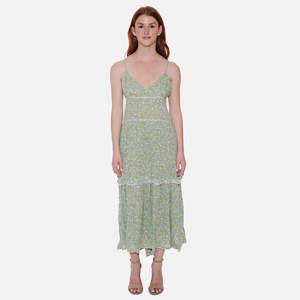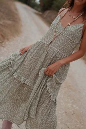 - Kaki - 100% soft viscose - Long dress with tiers and a small ruffle - It has thin adjustable straps and a bare back with a beautiful V shape cut - Flowing and light, it is made for those pleasant sun-kissed days! - Our tip: twist its romantic look by wearing it with cowboy boots! - This One Size dress will fit sizes 34-40 (EU) / 4-10 (US) with its adjustable straps at the back and its loose cut - Wash at 30C and hang to dry - Style #: OLIVIA1 Mpn OLIVIA1 Sku SSTWSU23-07
