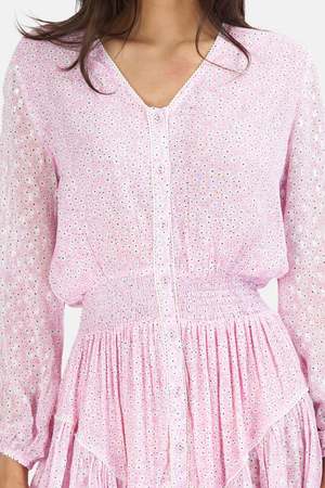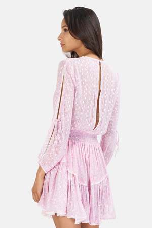 - Long-sleeved dress buttoned on the front - Smocked at the waist - Open back and sleeves tightened by ties - 100% Viscose - Hand wash cold - Imported - Style No. YELENA - Color: Pink Sku SSTWSU22-29 Mpn YELENA Productcode SSTWSU22-29