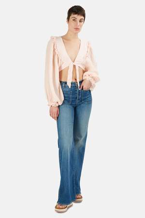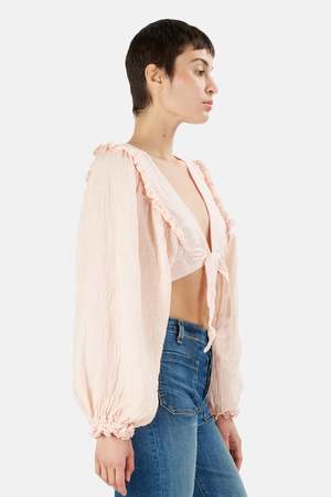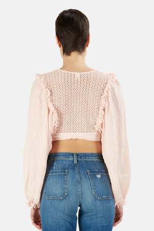 - Ruffled in their French linen - Delicately embroidered with eyelets - Tie front closure - Elasticized cuffs - 100% linen - Dry clean - Made in France Productcode SSTWSU21-31
