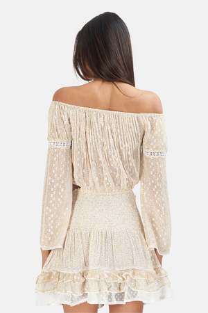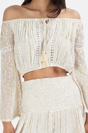 - Crop top with long sleeves and bare shoulders - Tightened by a tie - Floral pattern - Embroidered finishes - 100% Viscose - Hand wash cold - Imported - Style No. BANDOL - Color: Sable Sku SSTWSU22-17 Mpn BANDOL Productcode SSTWSU22-17