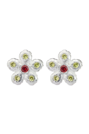 Crafted from quality 925 sterling silver, the FLOWER earrings are hand crafted, high polished and textured flower shaped earrings set with a variety of CZ stones. Designed in Sydney, Australia, these earrings are nickel-free, hypoallergenic and are available in silver and gold. Pendant size: 18 mm Stones: Green 3 mm, Red 4 mm Available in one size Be sure to remove them before swimming, exercising, bathing, and sleeping.