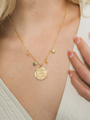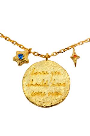 Crafted from quality brass and 18k gold plated, the LOVER Necklace features "LOVER YOU SHOULD HAVE COME OVER" engraved with a hand written font onto a 2.3cm pendant. Spaced around pendant are 4 dangling component including stars and daisy shaped mini pedants. This necklace nickel-free and hypoallergenic necklace is designed in Sydney, Australia. Dimensions: Chain 45cm Stones: Blue, Purple, Olive green and White 3mm CZ Available in one size To ensure your LOVER Necklace maintains its beauty, take care not to wear it while bathing, swimming, working out, or sleeping.