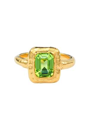Crafted from quality brass and plated with 18k gold, the LUMI ring is a solitaire textured ring, handcrafted with a single octagon stone and textured setting. This beautiful design originates from Sydney, Australia and is hypoallergenic and nickel-free. Stones: 6x8mm Green CZ Available in three sizes. To ensure your LUMI maintains its beauty, take care not to wear it while bathing, swimming, working out, or sleeping.