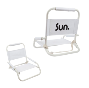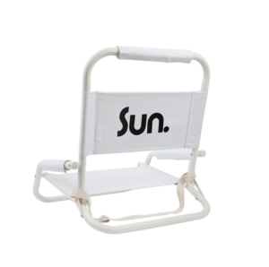 Bring your chic style to the beach or any space! Foldable and features an adjustable shoulder strap for easy carrying. This beach chair has a modern black and white aesthetic with the wording "Sun." on the backside in black. Made from 100% Recycled Polyester holds up 150kg / 331 lbs Powder coated aluminum frame Soft foam grips Adjustable carry strap Final Sale Item