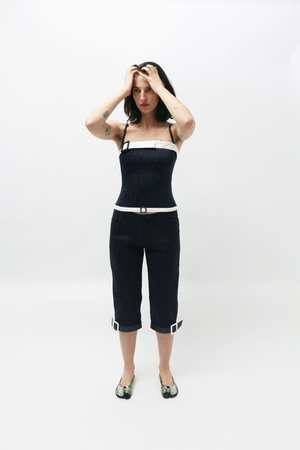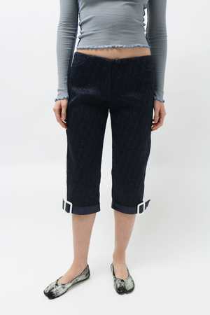 Navy cropped capri pants with all-over shirring, adorned with fabric appliqu belts at the bottom cuffs. Finished with front pockets and a zip fly closure.