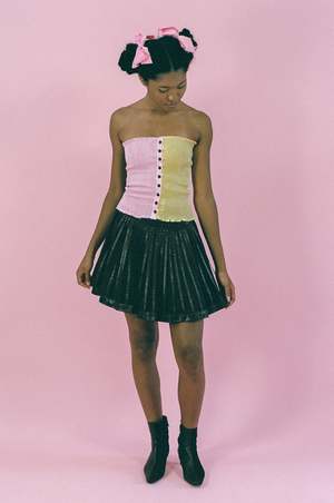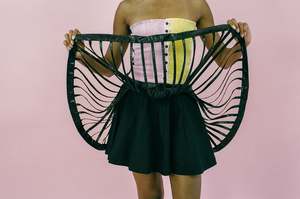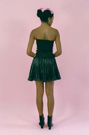 Low waisted flowy mini skirt in black with two fabric layers combined together creating dimension to a classic style silhouette: a silky smooth opaque base underneath a cotton bazin lattice cage. Hidden side zip and button closures. Measurements (laying flat): Size F34: Waist 29, Open hip, Length 143/4 Size F38: Waist 32.5, Open hip, Length 15.5 Trinity is 5'7 and a size extra small/small, and wears size F34 with the Farah Top in Pink and Yellow. Material: 100% cotton. Machine wash cold at 30 degrees. Can be machine dried. Warm iron only. Do not bleach. Made in Lebanon.