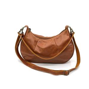 The Aurora Handbag is a supple, waxed leather shoulder bag with a curved silhouette and pleated detailing. It offers ample space for daily essentials and is suitable for travel or everyday use. The bag includes two strap options for versatile wear: a removable, adjustable crossbody strap and a removable shoulder strap. The interior features one zippered pocket and one open pocket for organized storage. Crafted from vegetable-tanned leather with a textured, waxed finish and finished with a polyester blend lining. Dimensions: 8" height, 12.5" width, 3" depth.