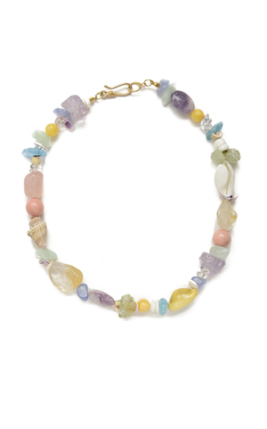 The beautiful pastel rainbow of houses built into the dramatic cliffs of the Amalfi Coast are the inspiration behind this necklace. Shell, quartz, agate, pink opal, citrine. 14k gold clasp. Made in New York. Most of our materials are one-of-a-kind, so the individual components of your earring may vary slightly in size and shape. Crafted from found, re-used, up-cycled, and natural materials, due to the handmade nature, subtle variations in color and shape make each piece unique.