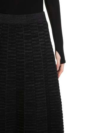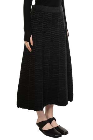 Swaying/knit redefines modern knitwear by fusing artisanal craftsmanship with contemporary design. Through innovative textures, intricate yarn play, and hybrid weaving techniques, each piece balances softness and strength, using premium European and Japanese materials for a luxurious hand feel. The Pleated Textured Wool Skirt in black features an elastic waistband, pleated design throughout, and a soft textural wool fabric. Color: Black Composition: Wool