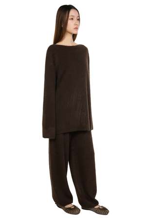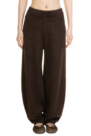 Swaying/knit redefines modern knitwear by fusing artisanal craftsmanship with contemporary design. Through innovative textures, intricate yarn play, and hybrid weaving techniques, each piece balances softness and strength while embracing sustainable fashion, as seen with the Yak Fleece Trousers. Swaying/knit Yak Fleece Trousers in grey brown yak fleece. Elasticated waist. Slightly curved leg. Soft, textural yak fleece fabric. Colour: Brown. Composition: Yak fleece.