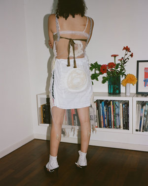 The Dot to Dot slip dress is a one-of-a-kind piece crafted from white tulle. The slip dress features an antique lace neckline, tufted wool embroidery and is layered with vintage doilies sourced from antique markets in the UK. The Dot to Dot Slip Dress is layered under the Bead & Fringe Crop Top and paired with the Dot to Dot Button Skirt. Each garment from the SS21 Rebellious Bird collectsion is a unique piece handmade by the designer in her London studio. U.K. 10, U.S. 6 Bust 36 Waist 34
