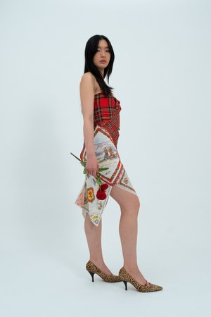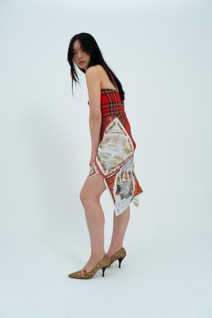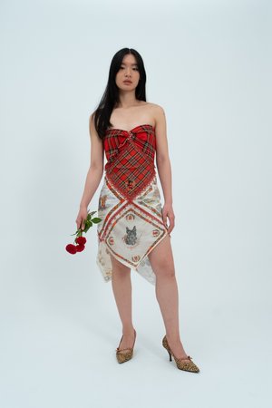 The Bonnie Lass dress celebrates Scotland with a bust constructed from vintage tartan that is mirrored at the back in a V shape panel. The dress also features a range of beautiful vintage collectsable hankies and an antique trim. Size: UK 8 / US 4 Item's Measurements: Bust 31" Waist 29" Hips 33"