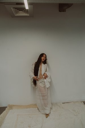 The Lauris Skirt is a flowing full length white cotton skirt featuring pin tucks and vintage doilies, with lace as a focal point at the waistband. The Lauris Skirt is paired with the Godolphin Kimono. Size: UK 10 / US 6 Items Measurements: Waist 34 Hips 42 Each garment from the AW22 Pearl Fishers collectsion is a unique piece handmade by the designer in her London studio. If you have any sizing or alternation enquiries please visit our Size Guide or contact info@sydneypimbley.com