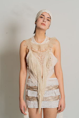The Vintage Label Skirt is a bespoke piece handmade from antique lace adorned with hand-sewn vintage shop labels, sourced from various antique markets over a collectsion of years. Each garment from the Woman is Fickle collectsion is a handmade and bespoke piece created by the designer in her London studio.