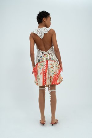 This stunning mini skirt has an A-line silhouette created by box pleats at the waistband. The waistband itself is crafted from stunning vintage collectsable floral patches. The main fabric of the skirt is a panel of vintage kimono silk fabric and features antique red trim. Size: UK 10 / US 6 Item's Measurements: Waist 30" Hips 38" Each garment from the SS23 Furtive Tear collectsion is a unique, handmade piece crafted by the designer in her London studio.