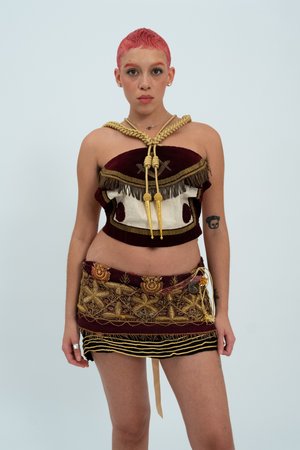 This brocade skirt is made from deep red wool which is covered in fantastic gold filigree embroidery. The skirt has a black and gold vintage trim hem and also features reclaimed jewellery and an antique money pouch at the waistband. Size: UK 12 / US 8 Item's Measurements: Waist 38" Hips 39" Each garment from the SS23 Furtive Tear collectsion is a unique, handmade piece crafted by the designer in her London studio.