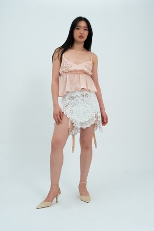 The Florette Skirt is a one-of-a-kind piece made from a patchwork of vintage doilies. Reclaimed jewellery and suspender attachments in a rose pink shade adorn the hem of the skirt. Size: UK 10 / US 6 Item's Measurements: Waist 32" Hips 39" Each garment from the SS23 Furtive Tear collectsion is a unique, handmade piece crafted by the designer in her London studio.