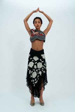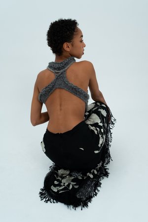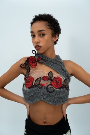 A grey hand knit panel sweeps around the bust, back and neck to create this crop top. Embroidered roses are appliqud across the bust on a sheer mesh panel. The top also features a hidden underwire for extra support. Size: UK 12 / US 8 Item's Measurements: Bust 39" Each garment from the SS23 Furtive Tear collectsion is a unique, handmade piece crafted by the designer in her London studio. If you have any sizing or alternation enquiries please visit our Size Guide or contact info@sydneypimbley.com.