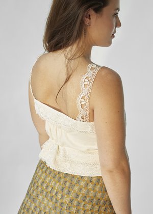 This lovely white crop top has been made using the finest quality vintage white cotton. Beautiful antique lace gloves decorate the bust and elasticated gathering at the back of the top adds a lovely level of detail. Size: UK 12 / UK 8 Item's Measurements: Bust 36" Each garment from the AW24 You, Who Know What Love Is collectsion is a unique, handmade piece crafted by the designer in her London studio.