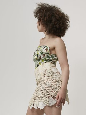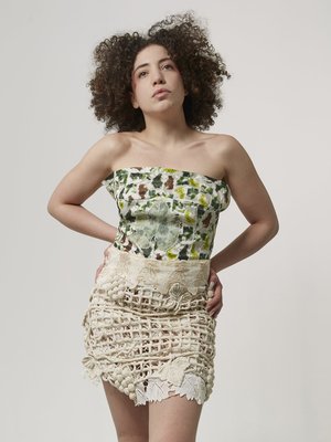 The strapless Vine Top is made sewing panels depicting grapes and vine leaf print. It is decorated with a sheer organza vine leaf appliqu and antique bobbin lace trim. Size: UK 10/ US 6 Item's Measurements: Bust 35" Each garment from the AW23 None Shall Sleep collectsion is a unique, handmade piece crafted by the designer in her London studio.