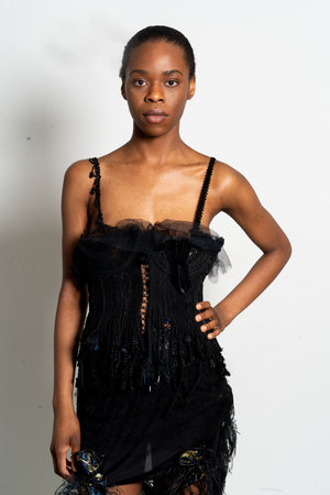 The Lola Bustier is a one-of-a-kind garment handcrafted entirely from recycled and vintage trims, sourced from various antique markets over a period of years. The black boned bustier features a backless design with delicate beaded straps and intricate hook and eye closures at the front. Each garment from the Woman is Fickle collectsion is a handmade and bespoke piece created by the designer in her London studio. U.K. 10, U.S. 6 Bust 34 Waist 30