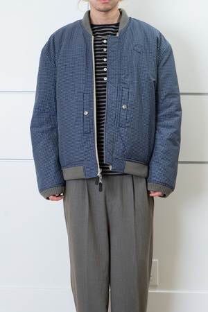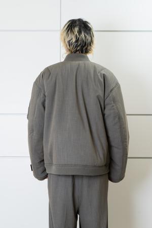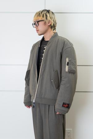 An oversized MA-1 bomber jacket with padded construction. The outer shell is made from a vintage-inspired three-tone woven suiting fabric, offering visual depth and a refined texture. Designed with contrasting colors and mixed materials between the shell and lining, it has a substantial weight yet remains soft and comfortable to wear. The interior features a nylon-blend lining for comfort. Finished with a YKK double-ended zipper and leather zipper pull. The jacket is reversible for versatile styling, with the reverse side designed for wear without zipper closure. Ribbed cuffs and hem provide structure. A Syumen logo2 patch decorates one sleeve, and sculpted paneling at the back shoulder and sleeves enhances the three-dimensional silhouette when viewed from the side. Composition: Shell: 52% Polyester / 25% Rayon / 19% Linen / 4% Nylon Lining: 90% Nylon / 10% Polyester Made in China. Model is 178 cm / 68 kg and is wearing size 2. Size chart (approx.): Size 12 Chest: 27"27.5" Sleeve: 26"27" Length: 31"32"