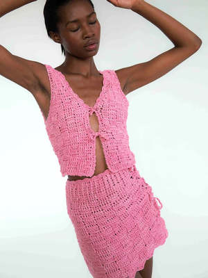 Handmade sleeveless crochet top with tie front closure. Featuring a v-neckline. Pair it with jeans or match it to the Lur skirt for a head to toe look. Colour: Pink Material: 100% Cotton Size + Fit: UK / US given as a guide based on this product. Size S - UK 8 / US 4 Size M - UK 10 / US 6 Size L - UK 12 / US 8 TACH CLOTHING Tach Clothing is a brand from Uruguay. Each collectsion is made by local artisans with a focus on fair trade and ethical manufacturing. Tach are inspired by vintage and their pieces have a timeless appeal that will take pride of place in your wardrobe year after year. Known in particular for their unique knitted pieces, they have gained a cult following in the fashion industry.