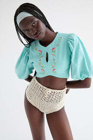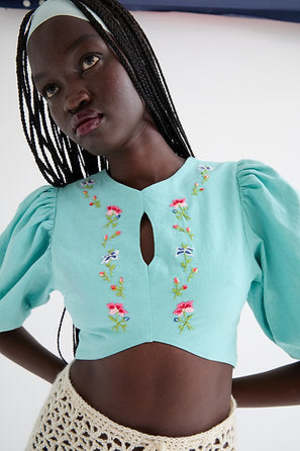 Hand embroidered flowers Open back Puff sleeves Lined button 70% Linen, 30% Viscose Sizes: X-Small: Bust 86cm/31in, Waist 62cm/25in, Hips 84cm/33in Small: Bust 90cm/34in, Waist 69cm/27in, Hips 92cm/36in Medium: Bust 97cm/38in, Waist 79cm/31in, Hips 102cm/40in Large: Bust 102cm/40in, Waist 84cm/33in, Hips 107cm/42in
