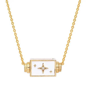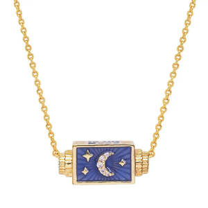 The To the Moon and Back Spinner Necklace from Tai Jewelry is a captivating piece that embodies the brand's dedication to quality and fine jewelry detailing. Born and raised in Bangkok and later moved to California, this pendant charm necklace exhibits a unique blend of influences. Like all Tai Jewelry, this necklace is a testament to the art of handcrafted jewelry and the artisans behind it. - Material: Brass, CZ, Enamel - Dimensions: - Length: 16" + 2" extender = 18" - Pendant: Length 18 mm, Width 8.5 mm - Made by Tai Jewelry