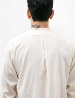 A relaxed fitting band collar shirt cut from an airy, lightweight cotton/rayon shirting with a subtle, irregular, textured check pattern throughout. Features a band collar with a rear button hole to attach a collar (a detail copied from the original reference piece dating from the 1910s), a clean finished rear yoke with a central inverted box pleat, a curved hem with a dropped back hem, and a scalloped edge at the base of the closure. Unusually simple for the reference period, the shoulders are cut without a significant slope and the armholes offer a full, loose fit both combining to create a generous, relaxed silhouette. Constructed with hard wearing chain stitched flat felled seams for a long lasting finish; completed with reinforcement gussets at the side seams and dark toned Mother of Pearl buttons throughout.