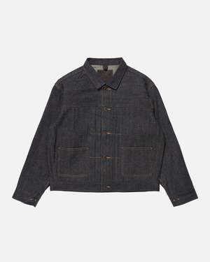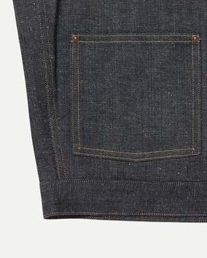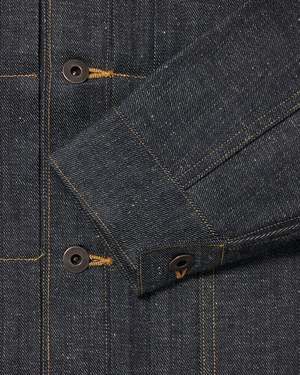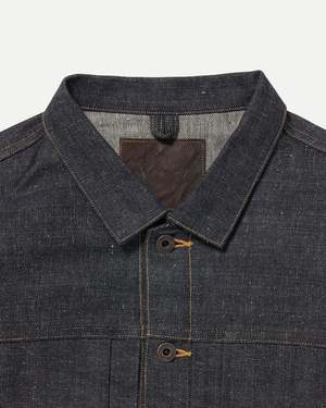 A vintage-inspired denim jacket using selvedge requires a back seam when graded to a larger size due to the limited fabric breadth. Seams change location with different ages and models, and for this design, a vintage piece was referenced, modestly incorporating side seams. It suggests a relaxed fit that can accommodate layered or thick innerwear. The jacket features custom-engraved iron buttons and buckles, adopting a new copper material the same as the LOT.701 Denim Jacket and LOT.702 Denim Trousers. The signature leather patch is mud-dyed in Amami Oshima Island. Main: 100% Cotton Made in Japan Style No. TTAW25714