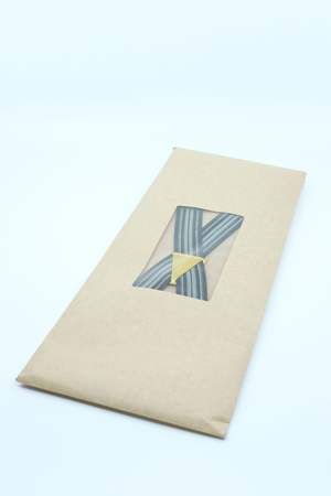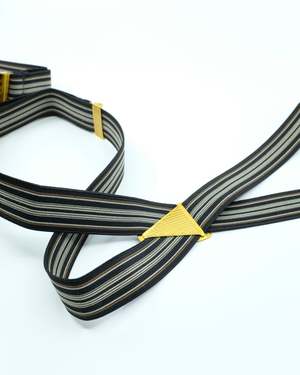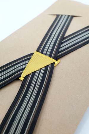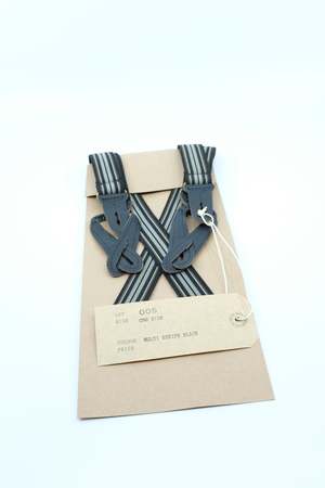 The suspender, one of Taiga Takahashis iconic items, is based on a suspender from the 1920s that Takahashi found in Ohio. He analyzed the original piece to determine the composition and knitting of the rubber part, which was made from cotton and rayon. In addition to preserving the original, beautiful multi-stripe pattern, he designed the clasp from scratch, inspired by Art Deco clasps popular in the 1920s. Materials: rayon, natural rubber, brass. Type: Accessories.