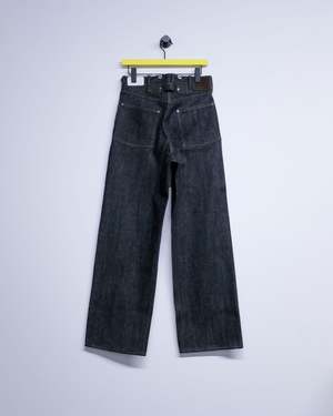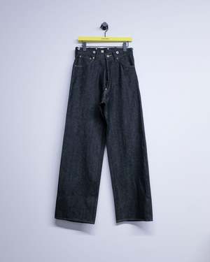 These notably high-rise jeans have a distinguishably wide silhouette with straight vertical lines from the thighs to the hems. Essential design elements such as the round curve of the front pockets and the buckle-back on the back are retained. The buttons and back-side parts, marked with original engravings, are all made of iron and left uncoated by design to develop an aged patina over time. All details from 1920s denim trousers are replicated by faithfully following the methods from that era. The signature leather patch is mud-dyed on Amami Oshima Island.