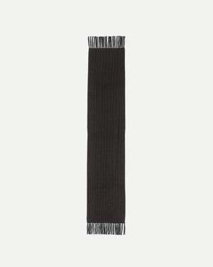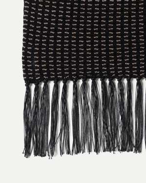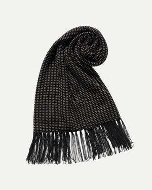 This scarf is based on a silk jacquard stole likely to be from the 1920s. Scarves were an essential item in styling in the past. This piece is designed with a narrower width to allow for layered styling under a jacket. The scarf features manually attached fringes made of original twist thread. Main: 100% Silk Made in Japan. Style No. TTCORE015_BK. Type: Scarves.
