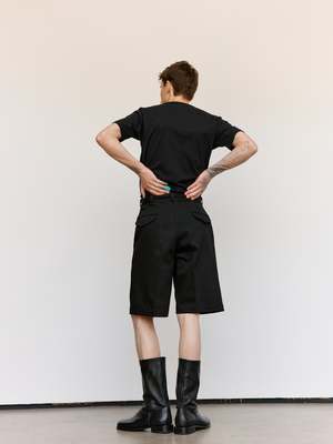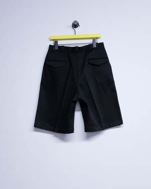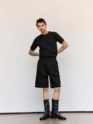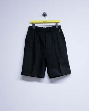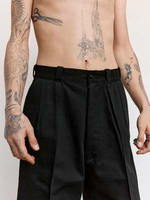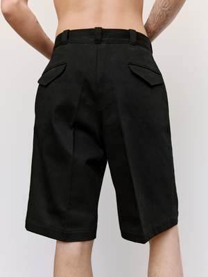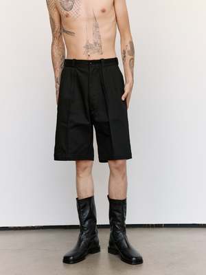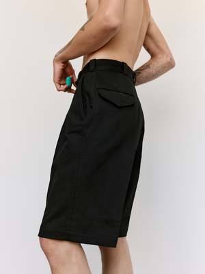 Based on U.S. Army Shorts made in the 1950s at a military-designated factory in Texas, the remodeled shorts feature a wider silhouette to outstand. The inner tuck of two pleats extends into a center pleat, presenting a refined take on casual shorts. Comfortably thick and textured katuragi (twill) fabric is used. The use of straight yarn without any unevenness results in a clean, defined twill pattern. The buttons and backside parts marked with original engravings are all made of iron, which is uncoated to produce aged beauty over time.