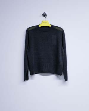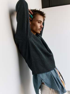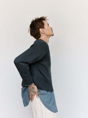 Based on an American work sweater in the 1930s, the sweater features unusually short length, wide waistband rib, tight armholes, and straight sleeves from shoulder to cuff. All these details embody techniques to realize the unique proportion T.T endeavors to achieve. Made from 100% linen yarn, the garment carries a moderate gloss and crispness.