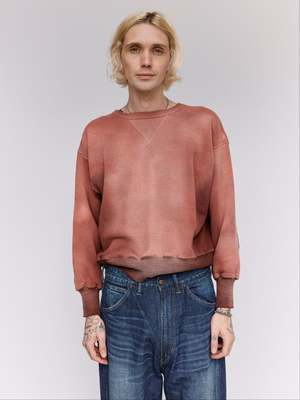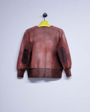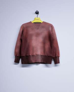 The LOT.603 Bleached Burgundy Cotton Sweatshirt by Taiga Takahashi takes inspiration from American sportswear before the 1950s, prior to the mainstream use of synthetic materials. Like the LOT.601 T-shirt, it features direct cutting lines and a flat shape. Vintage-inspired details include V gussets on the front and back of the neck to stop sweat, and elbow patch details reminiscent of repair patches found on vintage clothing. During times of material scarcity, clothing was treated as a valuable resource, with worn-out elbows often reinforced using leftover fabric, such as repurposed denim. The tubular jersey cotton is manufactured by a hanging knitting machine in Wakayama, Japan. A Rongalite finish achieves a natural fade similar to that of a used garment.