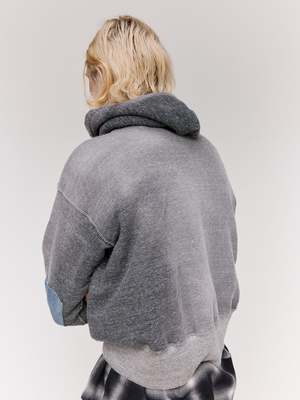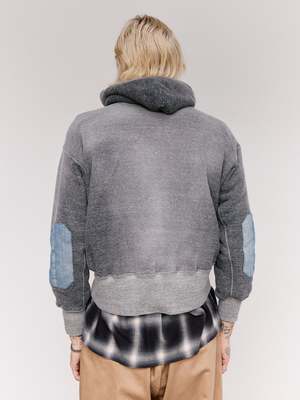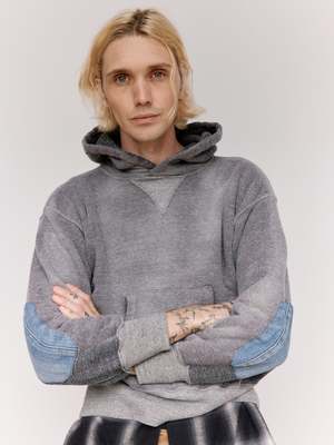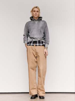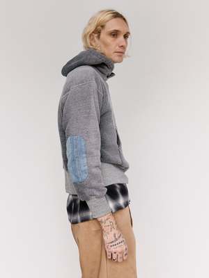This piece is a reconstruction of the Lot.606 Hooded Shirt, Taiga Takahashi's reinterpretation of the classic "Retrofit hoodie." Elbow patch details are added in the style of vintage clothing often found with repair patches. During times of material scarcity, clothing was treated as a valuable resource, and users often reinforced worn-out elbows with leftover fabric. Workers frequently repurposed damaged denim as patch material for reinforcement. The tubular jersey cotton is manufactured by a hanging knitting machine in Wakayama, Japan. A Rongalite finish achieves a natural fade reminiscent of a used garment. 100% Cotton.