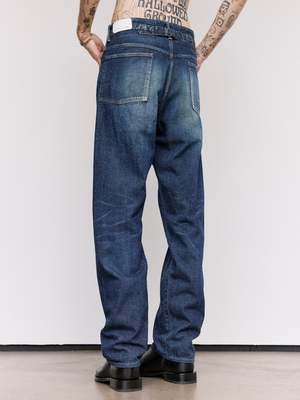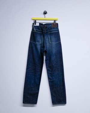 Inspired by dead stock denim washed several times for softness and comfort, these trousers pursue a natural fade and enhanced wearer's comfort. Crafted from selvedge denim with a white edge, visible in details like the reverse side of the belt. The design references 1940s denim jackets, with original Art Dco-inspired buttons and rivets in a custom color. Features a signature leather patch mud-dyed in Amami Oshima Island. Material: Cotton.