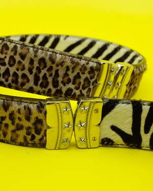 Cow leather belt featuring a multi-print design with white zebra and brown leopard patterns. Made from cowhide. Available in sizes L (81 cm) and XL (86 cm).