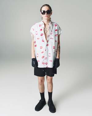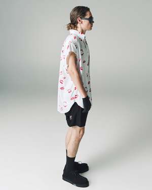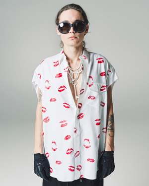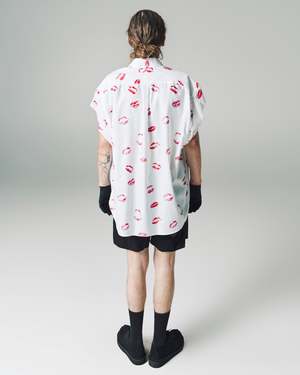 Oversized button down with cut off sleeve detailing including raw hems on the arms. Drop Tail hem with a subtle faded stamp detail at the front hem. Detailed with a front chest flap pocket. Made from cotton. Model wears size 46.