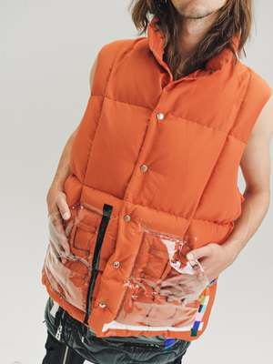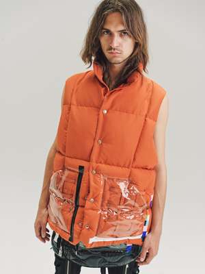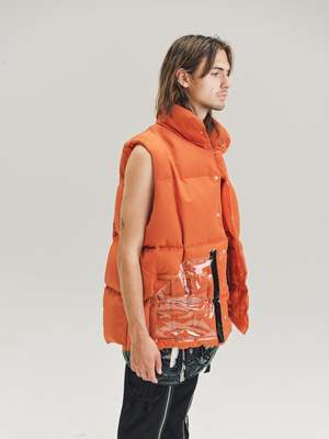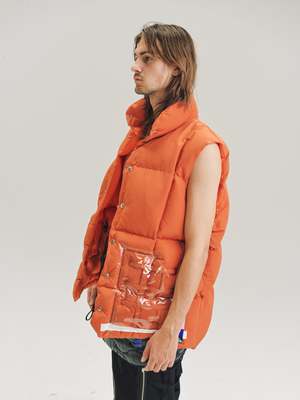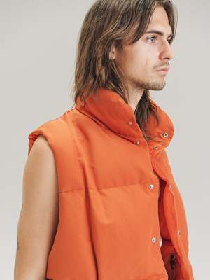 Oversized Mountain Vest in orange cotton / nylon. Cotton / Nylon Blend Model wears Size 48
