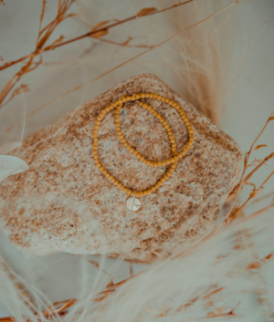 Richly dyed heirloom tulsi bead bracelet grounded by a hand-shaped moon disk charm. Hand carved charm with 14 karat gold finish. Hangs 14 long on hand carved and naturally dyed Tulsi beads.