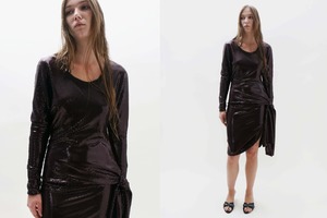 Deep burgundy long-sleeve sequin dress with a gathered, adjustable side tie and a side slit. Tori is 5'9" tall and measures 33" bust, 24 waist, 34" hips and wears a size S. Fabrication is 97% Polyester, 3% Elastane. Made in Italy.
