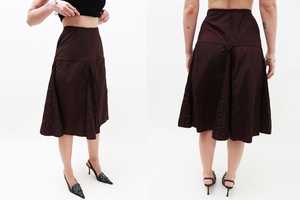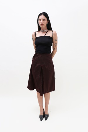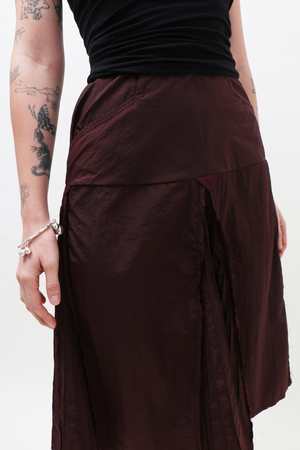 Burgundy pleated midi skirt in a high-waisted silhouette, detailed with godet panels, functional pockets, and subtle grosgrain trim. Made from lightweight nylon. Ilana is 5'8" tall and measures 32 bust, 24 waist, and 36 hips and wears a size S. Fabrication is 100% Nylon. Made in Italy.