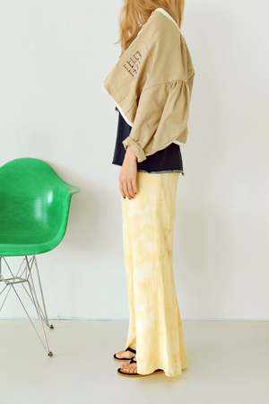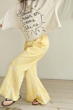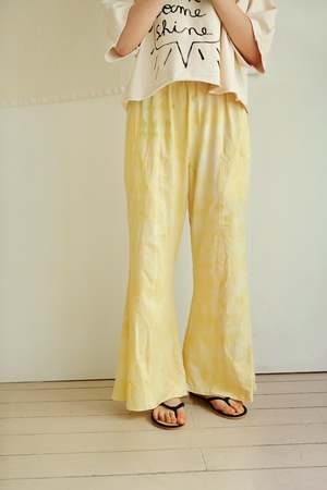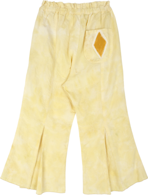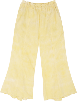 From Tambere for Spring/Summer 2022. Beautifully cut trousers in a pale yellow tie dyed cotton. An easy and relaxed take on a bell bottom silhouette, these pants feature a pull on waist and inverted pleat at the bottom. - Girl's pants - 60% cotton 40% rayon - Color: Pale Yellow - Elastic waistband with ruffle detail - Side seam pockets - Back pocket with diamond patch - Flared leg - Full length
