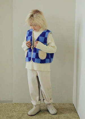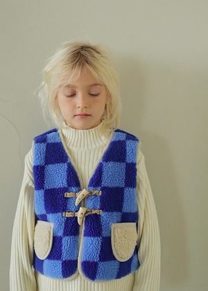New from Tambere for Autumn / Winter 2022. Cozy faux shearling vest in a dark blule and azure checker print. - Unisex kid's waistcoat - Outer: 70% polyester 30% acrylic, Lining: 100% cotton - Sleeveless - Horn toggle closure - Contrasy ivory patch pockets - Contrast ivory trim
