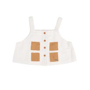 New from Tambere. Summery white crop top to wear with baggy pants. Can be worn backwards, too. Hemline is lined with Liberty fabric for a fun flash of print. Finished with toffee buttons along the front and sheer square patches and tiny blue embroidery. - Kid's top - Outer: 100% cotton Lining: 100% cotton - Color: White - Sleeveless - Elastic shoulder straps - Contrast button closure and decorative patches - Cropped length