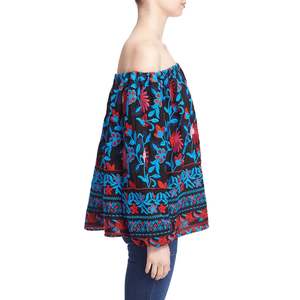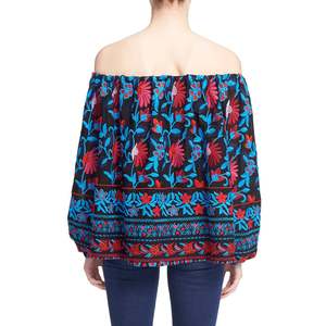 Slips on over head Off-the-shoulder neckline Long bell sleeves with elasticized cuffs 100% polyester Dry clean